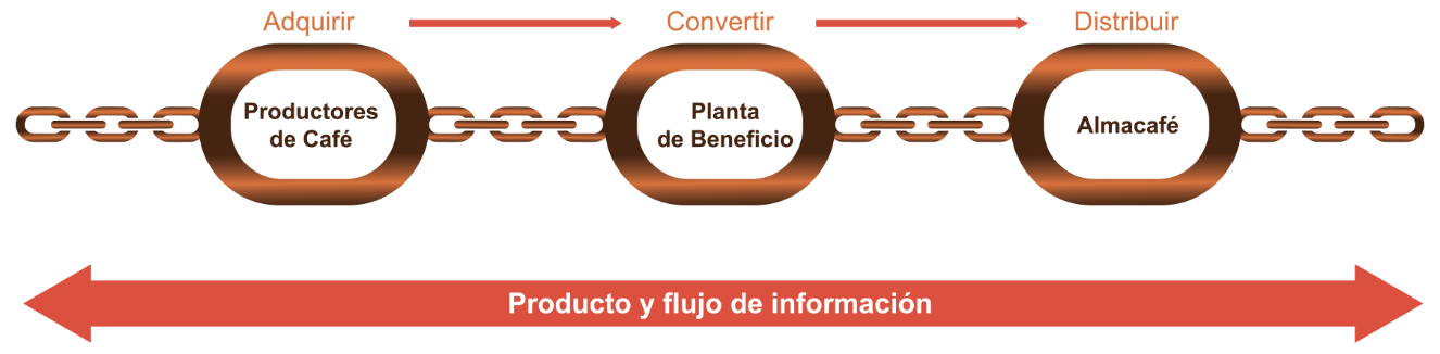 Así entonces, la cadena de suministro está presente en cada fase del proceso de un producto como el café, englobando todas las actividades de gestión y logística, desde la adquisición de la materia prima por parte de los productores de café hasta la entrega del producto terminado al operador logístico Almacafé.