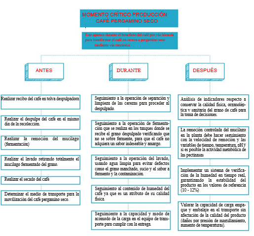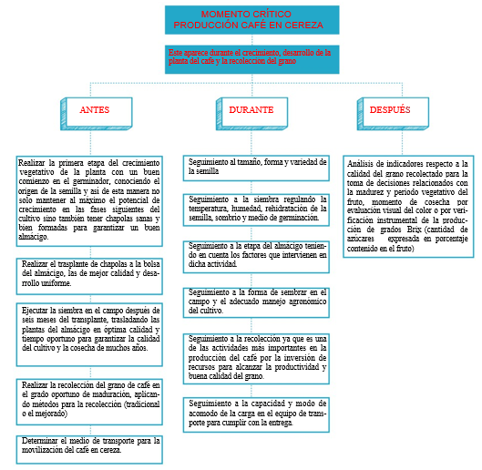 En las Fig. 4,5 y 6, se indican los momentos críticos de los tres eslabones, esto es: producción de café en cereza, producción de café pergamino seco y trilla del café.
