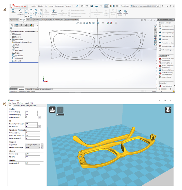 The frame design process was carried out in SolidWorks software and the model was subsequently exported to the Open Source Cura software, as can be seen in Fig. 2a and Fig. 2b. In the mentioned machine, six frames were manufactured with the dimensions established by the NTC 5607 standard. Under this perspective, the standard suggests applying the dimensional stability tests at high temperatures, the sweat resistance test, and the ignition resistance test. The above was carried out in the laboratory of the ECCI University.