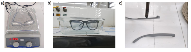 The normative reference contemplated in NTC 5607 in numeral 4.6 establishes a tolerance of +/- 5mm for the dimensional stability test at high temperatures (see Fig. 3a). The results obtained allowed to identify a variation of the frontal (0.097 mm), height (0.047 mm) and arms (-0.409 mm) measurements. The foregoing verifies that the selected material does not show a greater variation, these being within the specified tolerance range. Regarding the test for sweat resistance (see Fig. 3b), the standard indicates in numeral 4.7 that there should not be a change of color in the frame excluding the hinges and screws after 8 h. In this regard, it can be determined that the sample exposed to the test does not present significant variation in coloration on its surfaces (front and arms) and especially on those that will have contact with the skin of the end user. However, it is evident that in some sectors of the sample there is separation of some of its printing layers. Finally, the results for the ignition resistance test (see Fig. 3c), the standard in numeral 4.9 indicates that the material must not continue combustion once the test bar is removed. When executing the test, it is possible to identify that the test piece does not show ignition after removing the metal bar. In addition to this, a deformation can be observed in the material due to the high temperature of the bar.