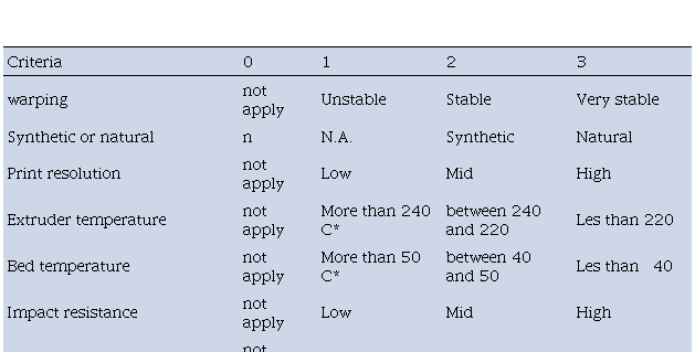 Once the possible materials with which the frames can be made with 3D printing have been identified, as can be seen in Table I, the development of the AHP method yielded a score of 22 for PET, 17 for POLYSTYRENE (HIPS), 17 for acrylonitrile butadiene styrene (ABS) and 20 for polylactic acid (PLA).
