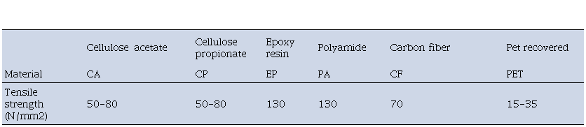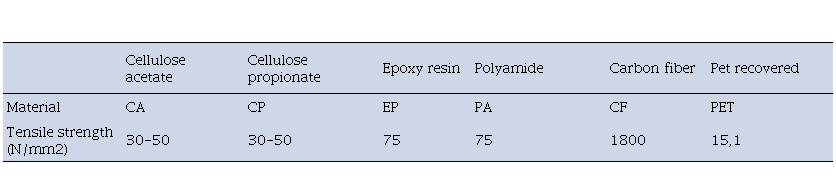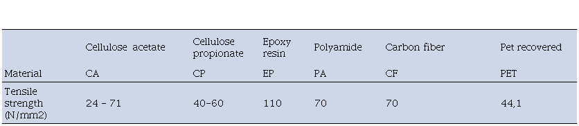 The results allowed us to identify that PET presents a better behavior compared to the most used and resistant commercial material known as acetate. This phenomenon can be explained by the fact that the level of crystallinity and the orientation of the fibers is not the same in extruded materials as in injection molded materials, which results in important differences in values.
