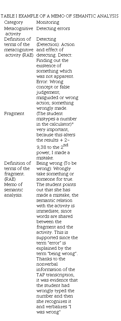In this step, the authors drew from the postulate of [29], who state that the taxonomy is a key structure to categorize the knowledge centered in semantics. Therefore, the researchers analyzed semantically the fragment and the metacognitive activity that had been previously enriched with the dictionary information. Thus, the authors recognized behavior patterns of the student during PS. The Table I exposes the memo of the activity “Detecting errors”.