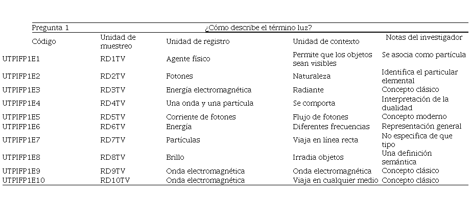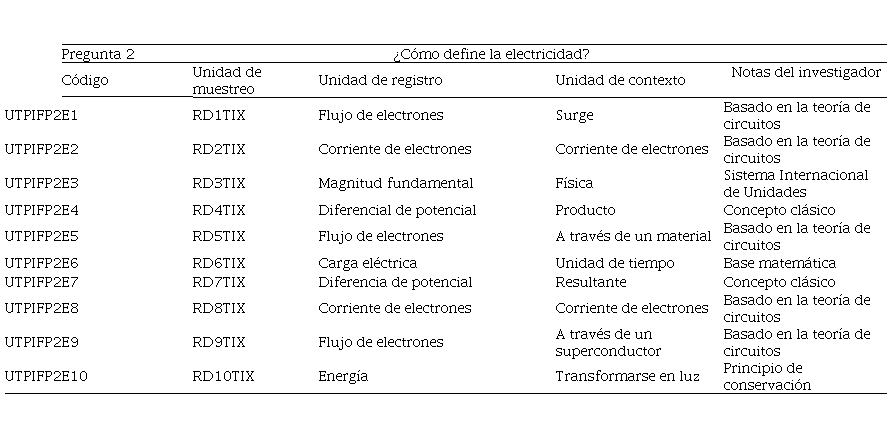 ontinuando el proceso, el investigador inicia la fase 2 donde se organiza la información con apoyo a la tabla II, en este recurso, se implementó un código que puede representar la respuesta y se exalta para su asignación tener en cuenta aspectos como la institución, el número de pregunta y el número de alumno. Ahora bien, la tabla estuvo conformada por una unidad de muestreo, donde se encuentra la respuesta realizada por el estudiante, una unidad de registro que representa el campo general que alude la respuesta, una unidad de contexto que le da sentido a la respuesta en mención y una nota donde resalta aspectos relevantes en cada respuesta [15].