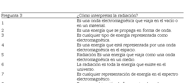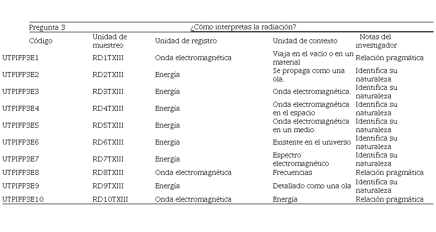 Así mismo, en la tabla XIV se sistematizó los datos cualitativos recolectados que corresponden a la pregunta 3, donde se indago sobre la interpretación de la radiación, siempre se mantuvo el mismo orden y relación de los estudiantes con respecto a las tablas anteriores.