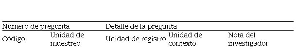 Fase 2: con base en la tabla anterior, se procedió a identificar la unidad de registro que se relaciona con el campo general a que hace referencia la respuesta y la unidad de contexto que da sentido a la misma. A continuación se hizo una lectura de la unidad muestral que es literalmente el dato recolectado y generó una percepción mediante una nota escrita. En la tabla VII se incluyó una codificación en las dos primeras columnas que da claridad a lo anteriormente expuesto: