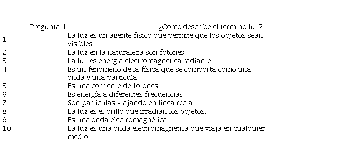 En este artículo se presenta una técnica de análisis de datos cualitativos donde se expuso un ejemplo práctico sobre el efecto fotoeléctrico, se realizó 3 preguntas abiertas a una muestra de 10 personas, de tal manera que sus respuestas se lograron asociar como una variable cualitativa [3], generando un proceso de análisis en 5 fases.