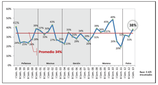 Dicha percepción de inseguridad está fuertemente relacionada con la calificación del servicio proporcionado por las instituciones estatales y bajos niveles de confianza en el sistema. Conforme a la encuesta de LAPOP (2012), la Policía Nacional, que hace parte del sistema judicial, puntuó con 53.5 %, y el sistema de justicia, integrado por otras instituciones del orden nacional, en 2012 solo obtuvo 48.9 %, lo cual es coherente con la existencia de un escenario de percepción de impunidad. En suma, en contraste con los resultados de la encuesta de la Cámara de Comercio de Bogotá del primer semestre de 2013, se identificaron bajos niveles de confianza en el desempeño de la justicia, y se priorizó como criterio de menor confianza la falta de rapidez y efectividad del sistema judicial, con un 8 % para 2013, y al compararlo con 2012 disminuyó en un 10 %, lo cual demuestra la necesidad de mejorar la imagen del sistema de justicia como un todo integral.