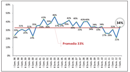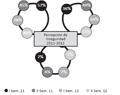 • Percepción de Inseguridad: En el segundo semestre de 2012, el 40 % de los encuestados percibió que la inseguridad había aumentado respecto a la encuesta anterior de la Cámara de Comercio de Bogotá, con una diferencia no tan significativa del 2 %, porcentaje que al ser comparado con el primer semestre de 2013 aumentó en un 7 % (ver figura 2).