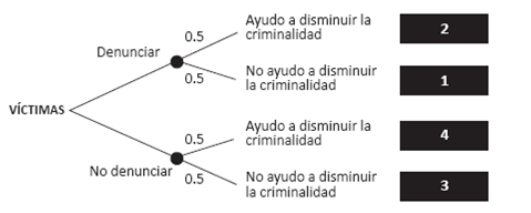 Partiendo del factor que más incidió en la generación de percepción de impunidad como precipitante de criminalidad: la no denuncia y ausencia de colaboración ciudadana12, se planteó un escenario orientado a conocer las lógicas con las que la ciudadanía toma decisiones en contextos de alta percepción de impunidad, en el que la mejor opción para el ciudadano es no denunciar ni colaborar pero verse beneficiado por factores externos relacionados con un buen funcionamiento y articulación del sistema judicial (ver figura 5).