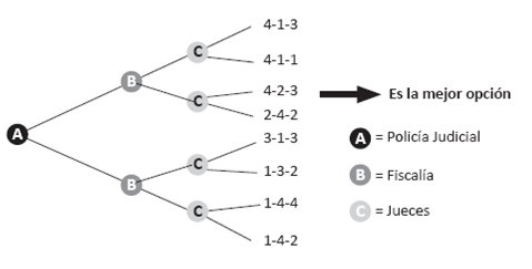 La policía judicial (actor A) como pilar esencial de la investigación judicial es quien plantea las bases del juego, el fiscal (actor B) direcciona y decide a partir del escenario planteado, y el juez (actor C) decide a partir de las actuaciones y decisiones de policía judicial y del fiscal, siendo los posibles escenarios:
