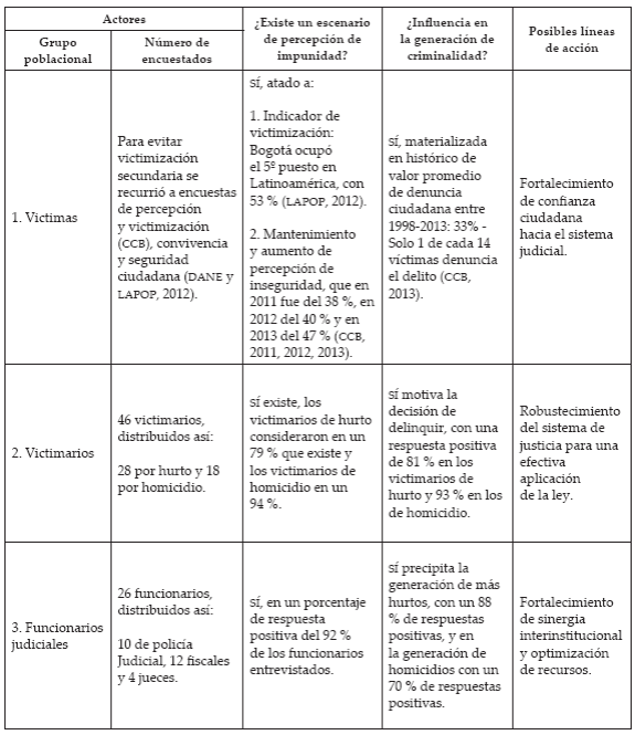 De acuerdo con las variables principales9 definidas para la consecución del objetivo del estudio, en la tabla 1 se condensaron los resultados generales de la investigación, los cuales deben ser leídos frente a cada grupo poblacional que conformó la muestra: víctimas, victimarios y funcionarios judiciales. Los actores se relacionaron en la columna 1 (grupo poblacional y número de participantes), plasmando frente a cada uno, en las columnas 3 y 4, que constituyen la columna vertebral de la tabla, la respuesta obtenida respecto a si existe un escenario de percepción de impunidad y su influencia en la generación de criminalidad respecto a los delitos de hurto y homicidio en la ciudad capital, respectivamente. Y en la última columna (5) se plasmó la principal posible línea de acción identificada por cada actor. Respecto a los tres grupos poblacionales se concluyó que sí existe un escenario de percepción de impunidad, el cual influencia y motiva la generación de criminalidad respecto a los delitos de hurto y homicidio en Bogotá.