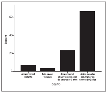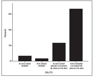 Como resultado del análisis realizado se obtuvo que dentro de la tipificación de los delitos, según la Ley 1238 de 2008 por medio de la cual se modificaron algunos artículos del Código Penal, Ley 600 de 2000, relativos a delitos de abuso sexual, que el 66,7 % (20 casos) correspondió al delito de actos sexuales con menor de catorce (14) años, siendo este el delito con mayor frecuencia; le sigue con el acceso carnal abusivo con menor de catorce (14) años con un 23,3 % (7 casos). El acceso carnal violento obtuvo un porcentaje del 6.7 % (2 casos) y el acto sexual violento un total de 3,3 % (1 caso) (ver figura 1).