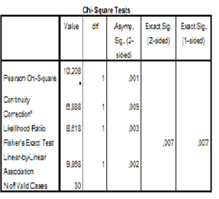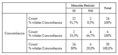 De acuerdo con el test Chi Cuadrado de Pearson, por el cual se hace necesario resaltar que esta prueba nos indica si existe o no una relación entre las variables, pero no indica el grado o el tipo de relación, se obtuvo un valor significativo de x 2(1, n=30) = 10,208a, y P valor o significancia asintótica bilateral de <.001; este valor P es la magnitud del error al aceptar la hipótesis de que existe una concordancia o coherencia lógica entre la decisión del juez y la mención pericial al momento de dictar sentencia; habitualmente este valor de significancia o alfa es del 5 % o en cifras decimales 0,05, y este valor está por debajo de este 0,05, y por eso podemos concluir, de acuerdo con el test de Chi cuadrado de Pearson, que sí existe tal correlación o coherencia entre la mención pericial y la concordancia del juez al momento de dictar sentencia (ver figura 13).