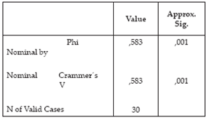 Por último se pudo obtener las medidas basadas en el estadístico Chi-cuadrado, que son los coeficientes Phi y V de Cramer, ambos coeficientes toman el valor 0, 583, con un nivel de significación crítico 0,001; lo cual implica la existencia de asociación entre las variables (ver figura 14).