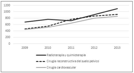En este caso Canadá se ubica en el segundo lugar, lo cual permite inferir que el servicio estaría siendo bien recibido por los usuarios de ese país. Finalmente, la cirugía cardiovascular con diferentes fines experimentó un crecimiento sostenido hasta 2012. Sin embargo se percibe un ajuste sostenido hasta 2014.