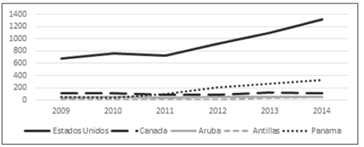 Estados Unidos es el de mayor demanda, con 864 unidades de servicio demandado, seguido de Panamá con 308, Canadá con 88, Antillas con 43 y Aruba con 27. En cuanto al porcentaje de participación, Estados Unidos cuenta con el 65 % de la demanda de este servicio, seguido de Panamá con 23 %, Canadá con 7 %, Antillas con 3 % y Aruba con 2 %.