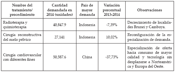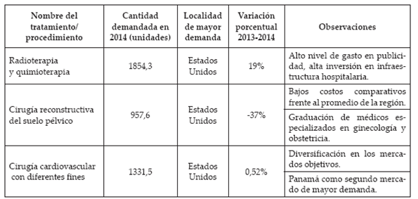 La siguiente tabla presenta la previsión de cantidad de procedimientos demandados en 2014, la localidad de mayor demanda, la variación porcentual con respecto a 2013 y las observaciones que justifican dichas variaciones. Se aprecia un aumento sustancial de la participación de la radioterapia y quimioterapia a lo largo del periodo de estudio en esta categoría. El gasto en publicidad por parte de entidades oficiales colombianas hacia los cinco países analizados ha promocionado más las ventajas competitivas del país andino frente a otros destinos en la región y el mundo.