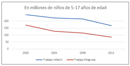 La propia Unicef presenta gráficamente sus Estimaciones sobre el trabajo infantil y el trabajo peligroso12000-2012, como se observa a continuación: