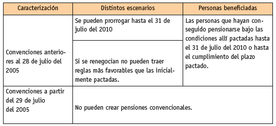 ► Las reglas pensionales vigentes a la entrada en vigor del Acto Legislativo 01 del 2005 por prórroga automática de la convención colectiva que los previó mantendrán su vigencia hasta el 31 de julio del 2010, ya que esta prórroga operará por mandato de la ley. Con todo, ni árbitros ni partes podrán pactar o establecer beneficios pensionales mejores en escenarios de negociación.
