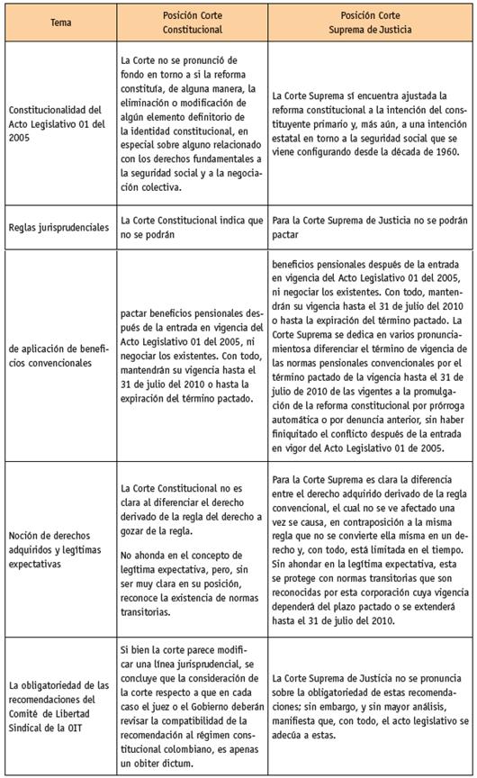 Así, el presente escrito analiza la posición de la Corte Constitucional y de la Corte Suprema de Justicia, Sala de Casación Laboral, en torno al pacto de beneficios pensionales que se dio tras la promulgación de la reforma constitucional en comento. Para esto se revisará lo relativo a: 1) la constitucionalidad de la prohibición de pensiones convencionales; 2) las reglas de aplicación del acto en torno a los beneficios pensionales convencionales pactados antes o después del acto legislativo; 3) la posición de cada corte con respecto a los derechos adquiridos de cara a la imposibilidad de pactar beneficios pensionales; y 4) la manera cómo han abordado la prohibición de pactar mejores condiciones de pensión dentro de convenciones y pactos colectivos ante las recomendaciones del Comité de Libertad Sindical de la Organización Internacional del Trabajo (OIT).