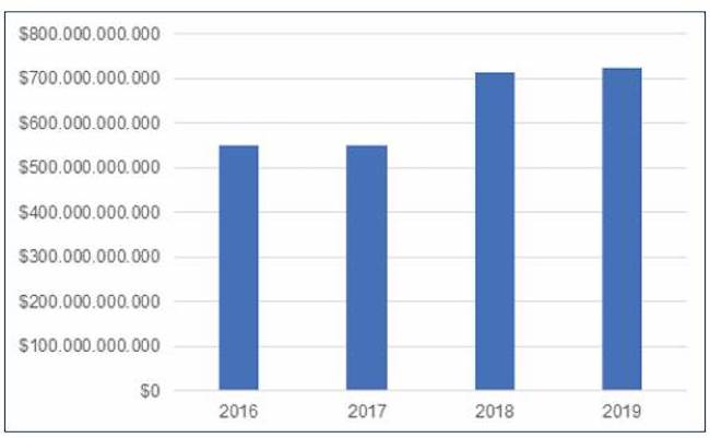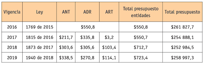 Entre 2016 y 2019, luego de un descenso casi imperceptible en 2017, el presupuesto de las entidades de la RRI (ANT, ADR y ART) aumentó en 2018 y 2019 (figura 1).