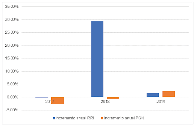 Sin embargo, al comparar los incrementos porcentuales del presupuesto de las entidades de la RRI y del presupuesto general de la nación, se observa un descenso en la financiación de estas entidades (figura 2). En la vigencia 2017, el presupuesto general de la nación y de las entidades de la RRI disminuyó. En cambio, en 2018, los incrementos del total de las entidades concernientes a la RRI mostraron una tendencia ascendente. Así, la vigencia 2017 tuvo una disminución del 0,01 % y en la vigencia 2018 aumentó un 29,40 %. Este comportamiento presupuestal tuvo mejor desempeño comparado con el del presupuesto total en las mismas vigencias, pues el presupuesto general en la vigencia 2017 disminuyó un 2,65 % y, en 2018, un 0,75 %. Sin embargo, en 2019, el incremento del presupuesto de las entidades de la RRI (1,50 %) fue inferior al aumento promedio del presupuesto general de la nación (2,38 %).