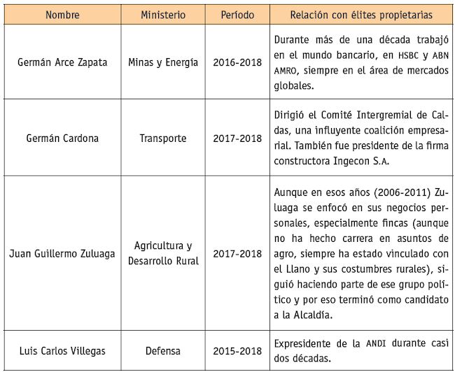 El acuerdo de paz entre el Gobierno Nacional y las FARC fue alcanzado durante el segundo periodo presidencial a cargo de Juan Manuel Santos (2014-2018). En 2016, año en que culminó el proceso de negociación, en el gabinete gubernamental se encontraban ministros con vínculos con el sector empresarial y gremial, que pueden leerse como un proxy de las élites propietarias. En la tabla 1 se encuentra el listado de los ministros con vínculos con las élites terratenientes durante el Gobierno Santos.