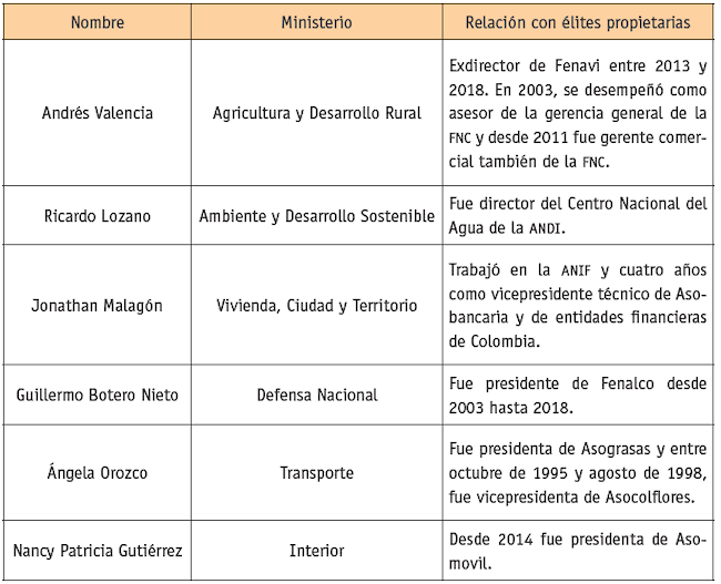 Además de estos respaldos que se atribuyen la vocería de los terratenientes y que conformaron la coalición que eligió a Duque presidente, los gremios aumentaron su presencia en el gabinete y personas provenientes de este sector fueron designadas en los cargos directivos de algunas agencias clave para implementar la RRI. En la tabla 2, se enlistan los ministros con vínculos con las élites terratenientes durante el Gobierno Duque a febrero de 2018.