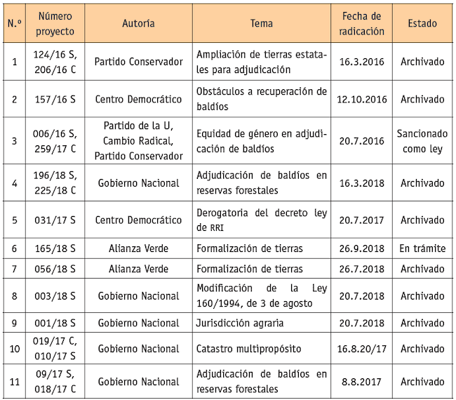 De la tabla 3 destaca que 9 de las 11 iniciativas legislativas relacionadas con la RRI que iniciaron su trámite en el Congreso han sido archivadas. Cabe señalar que el archivo de estas iniciativas en ningún caso ha sido resultado de la aprobación mayoritaria de una iniciativa en ese sentido. En cambio, el archivo señala que los mencionados proyectos de ley no culminan su trámite en el periodo que exige la ley. Esa dinámica de archivo por falta de trámite ha afectado tanto a iniciativas gubernamentales y de su coalición en el Congreso como a iniciativas de partidos independientes (Alianza Verde) y de la bancada en su momento opositora del Centro Democrático. También resalta que han sido archivadas iniciativas cruciales según Albertus (2015) para la implementación de cualquier reforma agraria, como la que trata del catastro multipropósito,12 pero también han sido descartados proyectos de ley de la bancada del Centro Democrático dirigidas a elevar las barreras para la recuperación de tierras públicas o la que deroga las normas con fuerza de ley adoptadas por el Gobierno Santos que dan sustento al Fondo de Tierras.