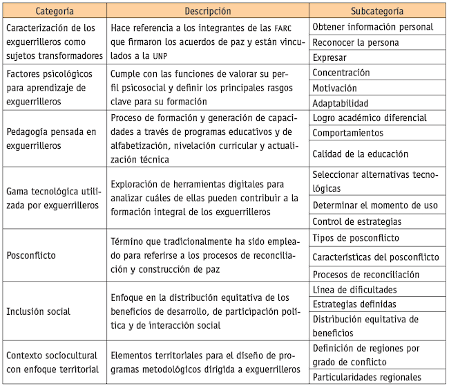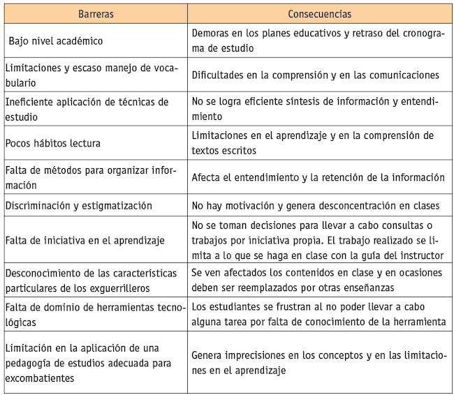 Las líneas generales de estrategias para la formación y el aprendizaje de exguerrilleros constituyen el objetivo central de la presente investigación. Los resultados obtenidos dan cuenta de las barreras y dificultades (tabla 2) que impiden el desarrollo en el proceso formativo de los exguerrilleros.