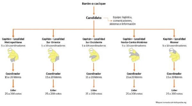 Son unas pirámides, hay unos que manejan la cuadra, otros el barrio, otros el sector, otros la localidad. Son personas6 que por su experiencia, tradición y conocimiento tienen una capacidad de manejo, entonces el líder de la cuadra maneja 25 a 40 votos, el líder del barrio 2000 votos, y así sucesivamente. (Líder barrial, comunicación personal, 11 de abril de 2017)