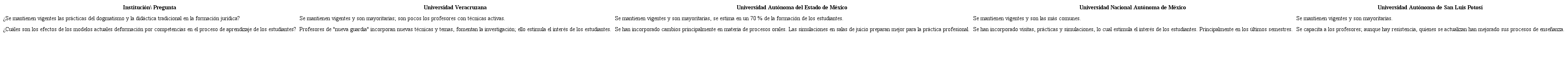 Las universidades que se tomaron como muestra fueron la Universidad Veracruzana, la Universidad Autónoma del Estado de México, la Universidad Nacional Autónoma de México y la Universidad Autónoma de San Luis Potosí; en cada una de ellas se aplicó la entrevista en formato no estructurado (Díaz, et al., 2013), sin criterios probabilísticos (Otzen & Manterola, 2017) pero que sí arrojan información relevante sobre la realidad de la formación jurídica en dichas instituciones educativas.