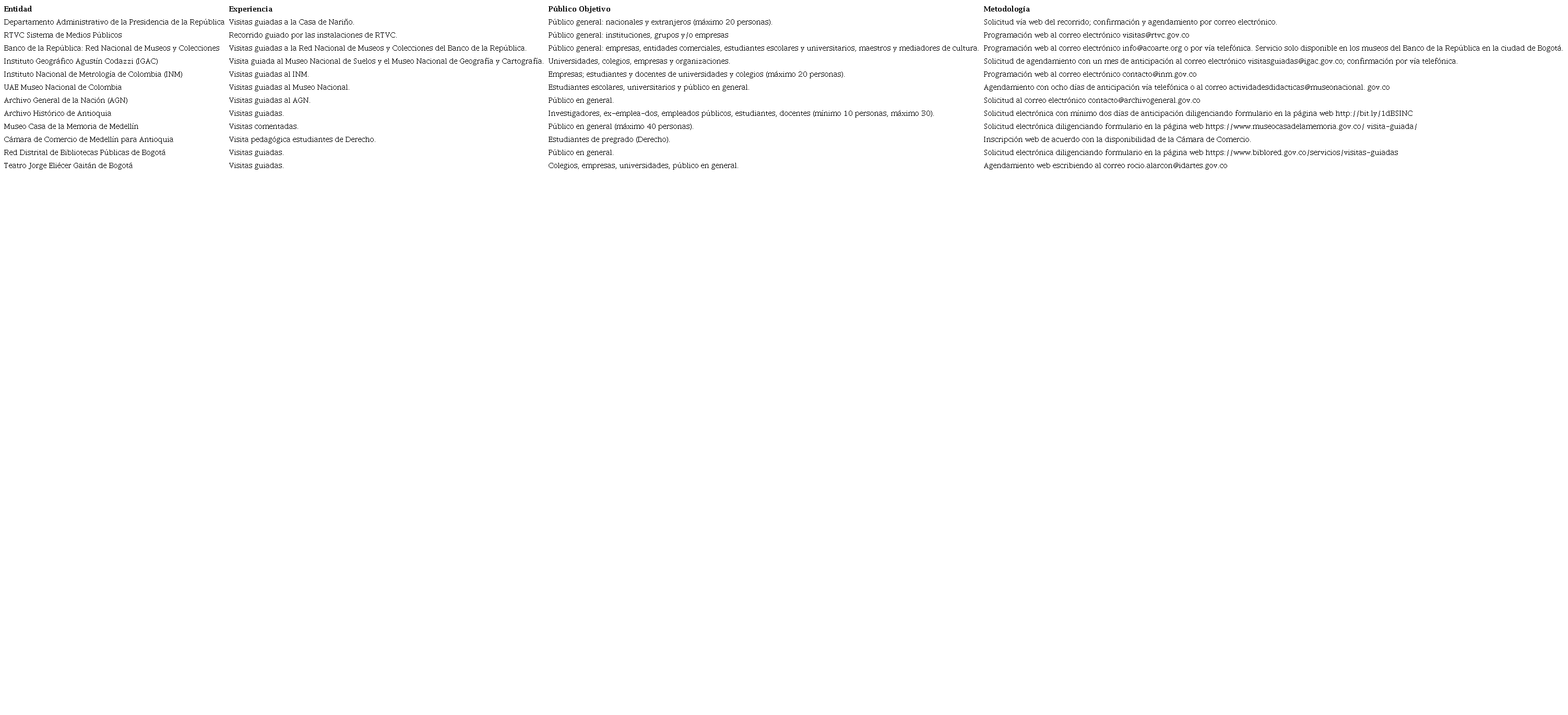 Nótese que estos servicios, si bien provienen de iniciativa de los organismos y entidades nacionales y territoriales con la finalidad de aproximar a los ciudadanos a las instalaciones y funcionamiento de los entes estatales, parten de una metodología pasiva por parte de la entidad, es decir, ofrece el servicio como posibilidad a la espera de una eventual solicitud de agendamiento. Por lo cual se torna compleja la posibilidad de diferenciar las experiencias académicas de dichos entes con las solicitudes autónomas, libres y voluntarias que puedan realizar los centros escolares, universitarios o grupos de personas de visitas guiadas a entidades y organismos que no ofrecen dicho servicio dentro de su portafolio4, dado que en ambos casos la entidad pública es receptora de las solicitudes y no generadora de los acercamientos.