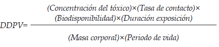 Para el cálculo de la evaluación del riesgo a la salud por la exposición, se tuvo en cuenta la metodología recomendada por la epa (Agencia de Protección Ambiental de los Estados Unidos), la cual se encuentra publicada en >el manual "Guía para la Evaluación de Riesgos en el Superfund", a través de la estimación por (DDPV) Dosis Diaria Promedio Vitalicia [13].