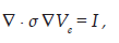 donde Ve es el voltaje de propagación, I representa la corriente inyectada en la estimulación y a es la matriz de conductividad del tejido cerebral. La ecuación (3) puede ser solucionada mediante aproximación por elementos finitos, debido a que no es posible hallar la solución analítica. El método de los elementos finitos consiste en dividir una estructura compleja en numerosas subdivisiones discretas para facilitar su análisis y estudio [22], [23]. En este enfoque las neuronas se representarán por modelos sencillos o múltiples, lo que permite determinar su dinámica dentro del campo de voltaje, e inclusive se incorporaráinformación detallada de atlas cerebrales, para mejorar aún más el modelo. Una vez que se ha caracterizado completamente las propiedades de las estructuras cerebrales (núcleo subtalámico, tálamo, sustancia Nigra) es necesario observar la difusión eléctrica de la dbs en función de los parámetros de estimulación y también de la impedancia de la interfaz tejido-electrodo.