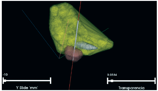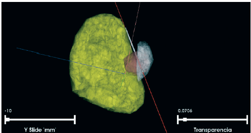 En las Figuras 9 y 10 se ilustra el tálamo (color amarillo), el núcleo subtalámico (color gris), el potencial eléctrico generado (color marrón), el electrodo de estimulación intraoperatorio (cilindro de color gris) y su trayectoria (línea roja), asícomo los ejes espaciales (líneas perpendiculares de color azul, rosado y verde). Las barras de "transparencia" y "Y slide" son para controlar el nivel de transparencia de los objetos de la escena y para mover el electrodo por la trayectoria definida en el planeamiento de la cirugía.
