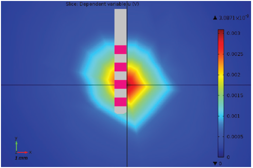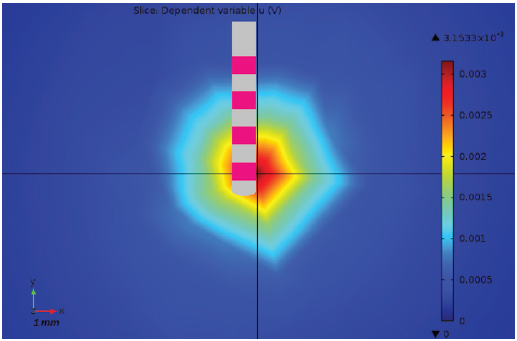 3. Estimación del potencial eléctrico: Luego de obtener la caracterización completa del comportamiento eléctrico de las estructuras cerebrales del paciente, se identifica la zona cerebral de estimulación. Finalmente, con la información de los parámetros de estimulación (amplitud, frecuencia, ancho de pulso, impedancia) y la matriz de valores de conductividad cerebral obtenida previamente, se estiman los valores del potencial eléctrico y su distribución espacial en las tres dimensiones. El resultado seráuna matriz tridimensional de valores de intensidades de activación eléctrica y cada dimensión es un eje espacial (x, y, z). El fenómeno de activación eléctrica cerebral se describe mediante la ecuación de Poisson [21], determinando el voltaje de activación como una función espacial junto a parámetros del tejido: