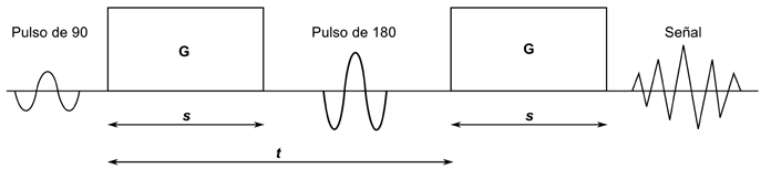 Las mri-dt son sensibles al desplazamiento molecular respecto al eje de los gradientes de campo magnético que se aplican para medir la difusión de agua. El protocolo estándar para la aplicación de los gradientes pulsados se conoce como pgse (Pulsed-Gradient Spin-Echo) [16]. Por lo tanto, la difusión en direcciones diferentes se puede hallar fácilmente mediante la variación de la dirección de los gradientes. En las dti, las intensidades de las imágenes dependen de la movilidad relativa de las partículas de agua en los tejidos. A partir de las medidas de difusión en varias direcciones se calcula un tensor para cada Voxel, el cual describe la difusión local de agua. Para lograr esto, típicamente se usa la secuencia de imágenes Stejskal-Tanner [16]. Esta secuencia usa dos pulsos de gradientes muy fuertes, simétricamente posicionados alrededor de un pulso de reorientación de 180° que permite una difusión controlada (ver figura 1). El primer pulso de gradiente induce un desplazamiento de fase para todos los spins y el segundo pulso lo revierte. Entonces el desplazamiento de fase se cancela para los spins estáticos. No obstante, para los spins que han cambiado de posición debido al movimiento browniano durante un periodo de tiempo, el desplazamiento de fase serádiferente para los dos pulsos de gradiente. Esto significa que no se reenfocan los dos pulsos, lo cual resulta en una pérdida de señal.