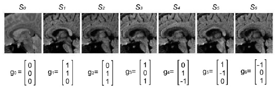 donde D es la difusión constante en el Voxel, S0 es la intensidad de la señal observada sin difusión ponderada (i.e b = 0 ) y Sk es la imagen con difusión ponderada (Diffusion Weighted Image- DWI). La cantidad de difusión ponderada estádada por el factor b, introducido por [17]. Además de la imagen base de referencia S0, existe la necesidad de hacer al menos seis medidas, usando direcciones de gradientes no colineales y diferentes para estimar el tensor de difusión simétrico D. Por lo tanto, se requieren mínimo 7 imágenes dwi con tensores ponderados y direcciones de gradiente diferentes para cada corte (slice) en el conjunto de datos. La Figura 2 tomada de [18], muestra un ejemplo de 7 dwi con las correspondientes direcciones del gradiente, donde S(/ S1,... ,S6 representan las intensidades de la señal en presencia de los gradientes gk para k = 0,1, 6. S0 es la medida básica de referencia con la que se obtienen las demás imágenes Sk, de modo que se insertan los gradientes g. Finalmente, es posible determinar el valor de cada una de las componentes de D, que debido a su simetría solo requeriráde seis gradientes para obtener seis ecuaciones. Se suele usar una mayor cantidad de gradientes para que la redundancia garantice una mejor resolución.