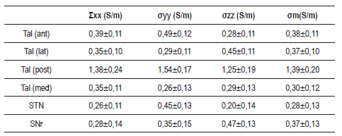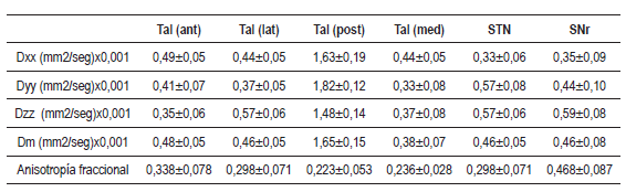 El tensor de difusión es una medida vectorial de la difusión de cada Voxel. Luego que se estiman los tensores, se utiliza el 3D slicer para ubicar la región de interés en las secuencias de imágenes, por medio del módulo de segmentación o etiquetado automático con Atlas cerebral. Para la cirugía de la enfermedad de Parkinson, la región de interés estácompuesta por el Tálamo, el núcleo subtalámico y la sustancia Nigra. Debido a que el tensor de difusión de cada Voxel contiene demasiada información y su procesamiento requiere un supercomputador, se obtienen los resultados de algunas métricas promedio para la región talámica (Tal), subtalámica (stn) y sustancia Nigra (snr), las cuales se consignan en la Tabla 1. (Error 1: La referencia: Tabla 1 está ligada a un elemento que ya no existe)