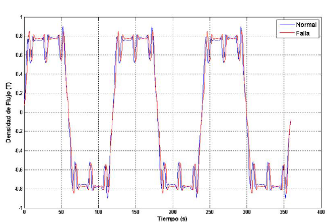En la figura 9 se puede observar que la densidad de flujo se conserva aún después de la ocurrencia de la falla. De ahíel incremento de las dos corrientes (IB, IC) que fluyen en el devanado de la máquina con el fin de conservar el flujo en el entrehierro. Este comportamiento se presenta en las cinco velocidades de ensayo.