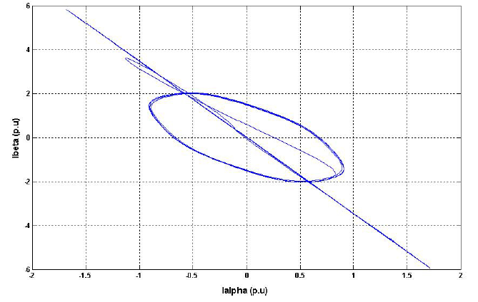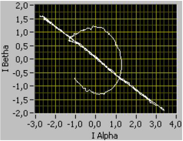 Al momento de ocurrir la falla y durante ella, se presenta el comportamiento de las corrientes en el plano por medio de una recta de pendiente negativa, la cual representa la condición de falla de fase abierta en este método de diagnóstico. Tanto para los ensayos MEF como para los realizados en laboratorio la pendiente se mantiene constante a las distintas velocidades de prueba (Figura 11), la Figura 12 presenta los resultados simulados para el PVA.