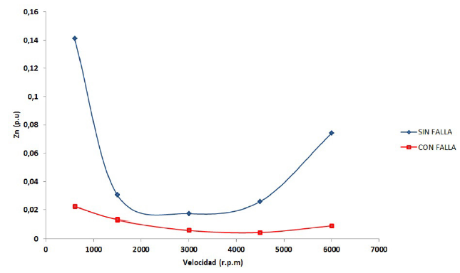 En la figura 15 se observa que el comportamiento de la impedancia con respecto a la velocidad se incrementa a medida que la velocidad del rotor es mayor, excepto para la velocidad de 600 rpm, debido a la estabilidad del control de la máquina lo cual aumenta los valores de corriente de secuencia inversa establecidos en esta.