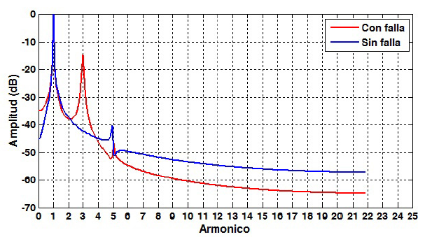 En los espectros de corriente para cada velocidad se puede observar el prominente pico del tercer armónico producido por la falla de fase abierta (Figura 10). La variación del tercer armónico es propia de las fallas relacionadas con el desbalance de las fases del sistema trifásico que alimenta la máquina y éste en particular, es un desbalance extremo de la fuente de alimentación trifásica. El tercer armónico para fallas de desbalances de tensión aumenta conforme el desbalance se haga más fuerte. Para este caso, el tercer armónico presenta la intensidad más grande que pueda tener en fallas de desbalance de tensión de una sola fase.