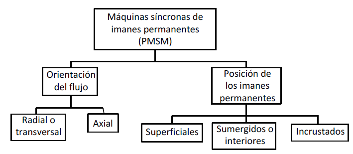La clasificación de las msip esta bifurcada de acuerdo con dos criterios; el primero es la disposición física de los imanes permanentes en el rotor de máquina, y el segundo es la orientación del flujo magnético de excitación con respecto a la alineación del eje de su rotor (figura 1) [7]