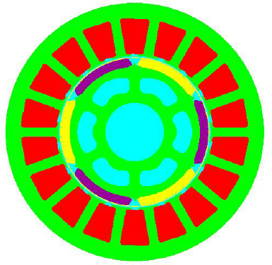 Como se ha mencionado anteriormente, las MSIP son máquinas de imanes permanentes cuya forma de onda de Fem es sinusoidal, por lo tanto, poseen semejanza constructiva con las máquinas síncronas convencionales [13]. La máquina objeto de estudio se muestra en la figura 2, en la cual se modela la sección transversal de la máquina de IP con el objeto de estudiar las variables en estado estable y bajo condición de falla de fase abierta.