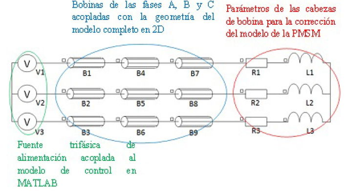 La representación del material de los conductores eléctricos del bobinado del inducido se parametriza por medio del circuito eléctrico acoplado al modelo geométrico de la MSIP, tal como se ve en la figura 4. En esta, se establece el valor de la resistencia que tendrán por defecto los conductores de las tres fases del devanado del estator. En cuanto a la permeabilidad magnética que éstos tendrán frente a los fenómenos magnéticos presentados en la operación de la máquina, se establecerácomo nula en las propiedades físicas del material.