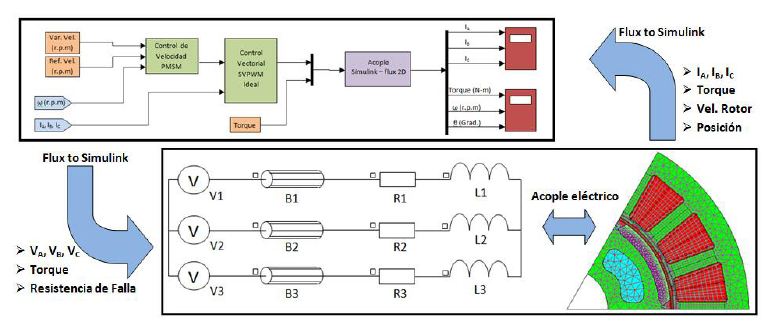El modelo del sistema máquina-control implementado mediante la interface Flux to Simulink®, con el cual se evaluóel sistema motor real, presentócaracterísticas de funcionamiento aceptables para la determinación del cambio de las variables de la máquina antes y durante falla de fase abierta, además de lograr un diagnóstico válido de la máquina para esta condición de falla.