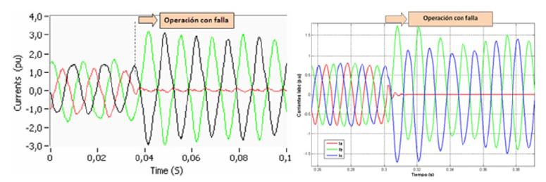 La figura 7 muestra las corrientes de las fases A, B y C obtenidas en laboratorio contra las obtenidas virtualmente. En estas se puede observar que la falla recae sobre la fase A, quedando las otras dos fases como únicas aportantes de todo el par necesario para mover la carga en el eje del motor.